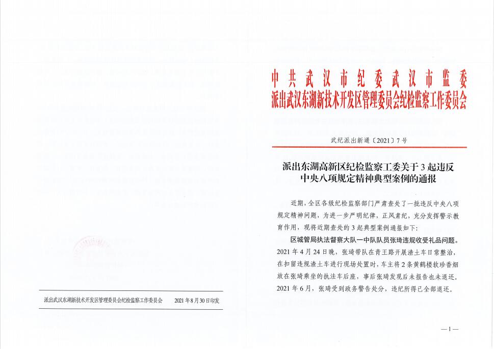 派出東湖高新區(qū)紀(jì)檢監(jiān)察工委關(guān)于3起違反中央八項規(guī)定精神典型案例的通報