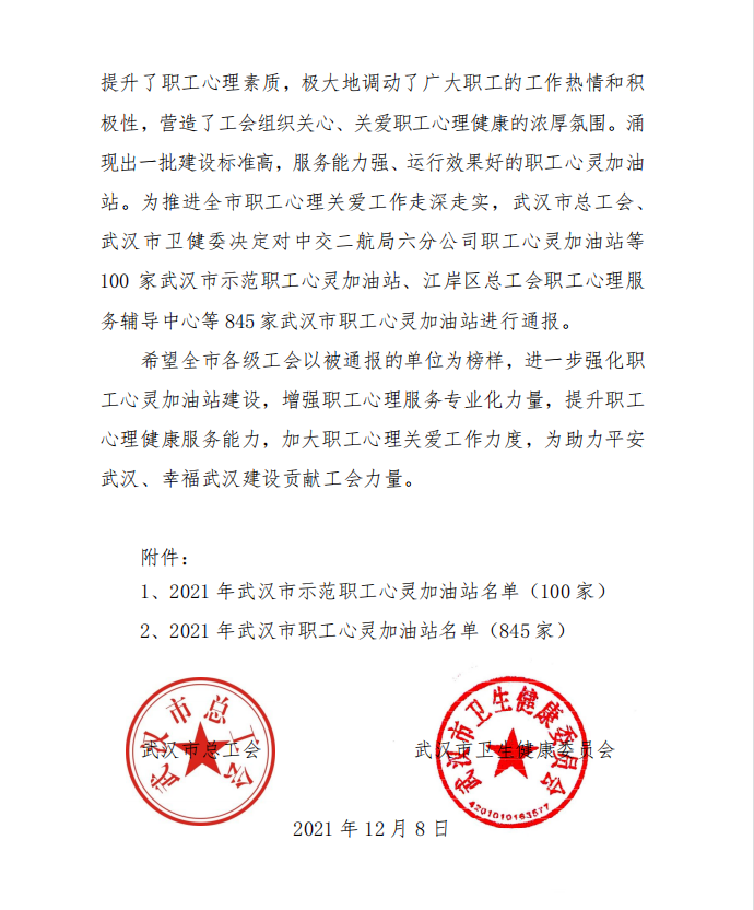 近日,武漢市總工會和武漢市衛生健康委員會聯合發文通報了2021年度武漢市職工心靈加油站工作情況,產業園公司榮獲“2021年度武漢市職工心靈加油站”稱號!